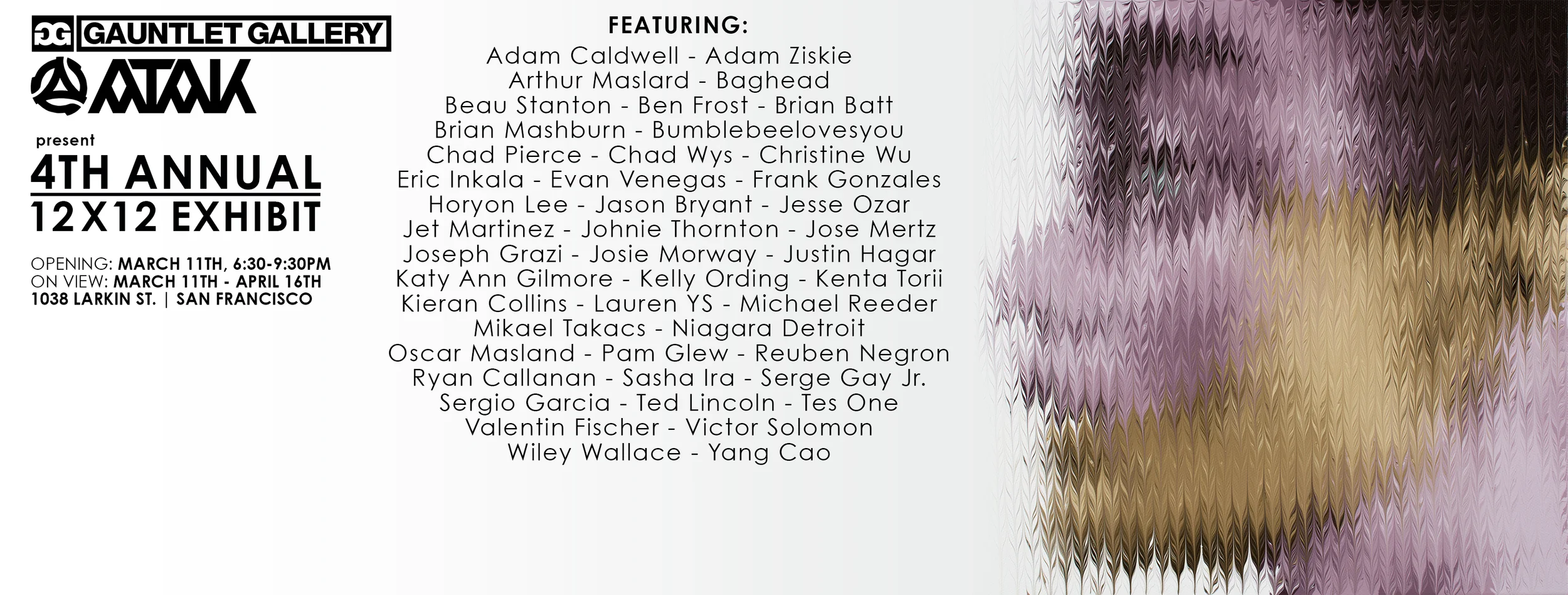 We are excited to announce that ATAK will be co-currating with Gauntlet Gallery. To kick off our first show of 2016 we are pleased to present the 4th Annual 12x12 Exhibit.