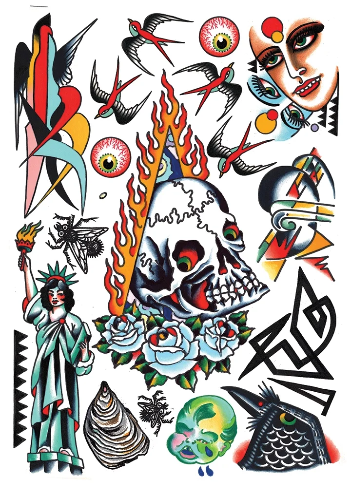 Some sheets are automatic black linework, others bursts of color and influence, but all of them carry the spirit of tattooing: make something, make it your own, keep moving forward.